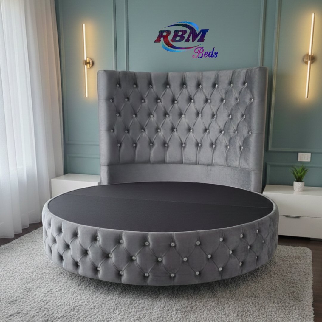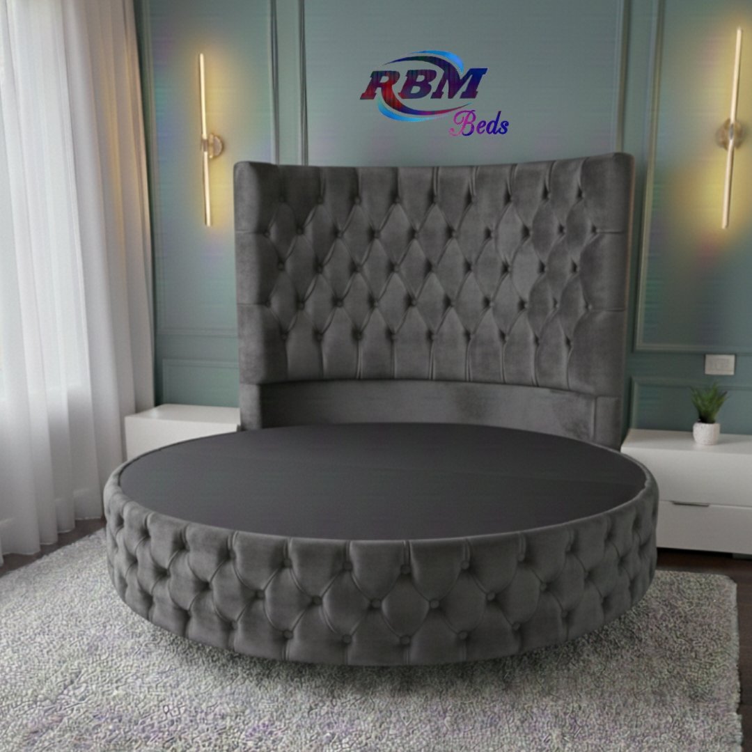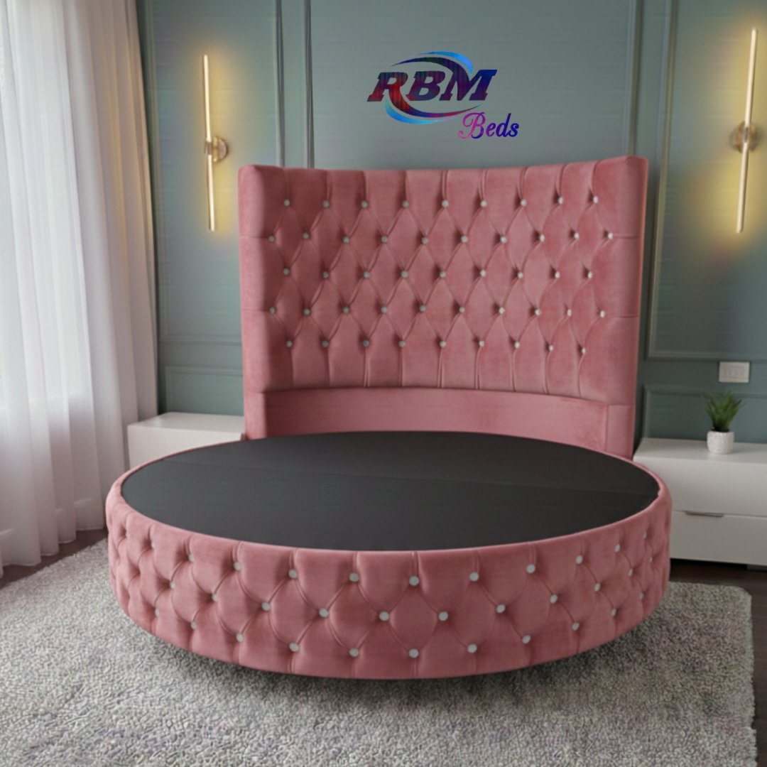 The Circular Round Bed will bring theatrical glamour to your bedroom. Designed for immediate impact and handmade exclusively in the UK, this stunning circular bed is an iconic centrepiece for your home with buttons and Diamonds details. The solid structured base separates into two half-moon sections, which gives you ease of access to most bedrooms. The headboard goes directly against the wall and does not require any fixing. Our round beds are simply placed against the wall. The half-moon round bases fit neatly and securely inside the headboard, slotting directly into place. Once positioned, the mattress is placed on top to complete the setup. Our Footstools and Blanket Box etc don’t come in a rounded shape; they are supplied in a rectangular shape.