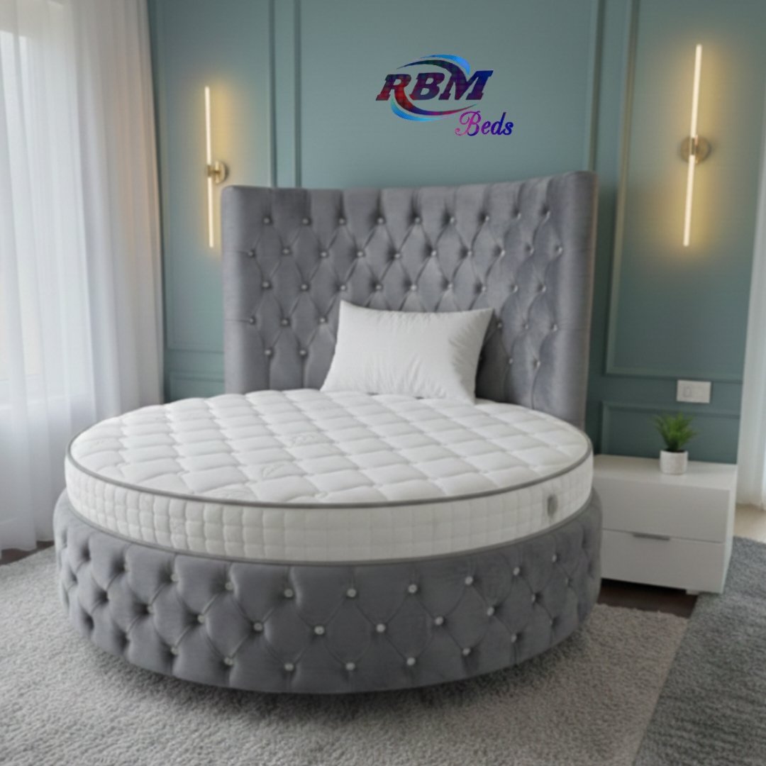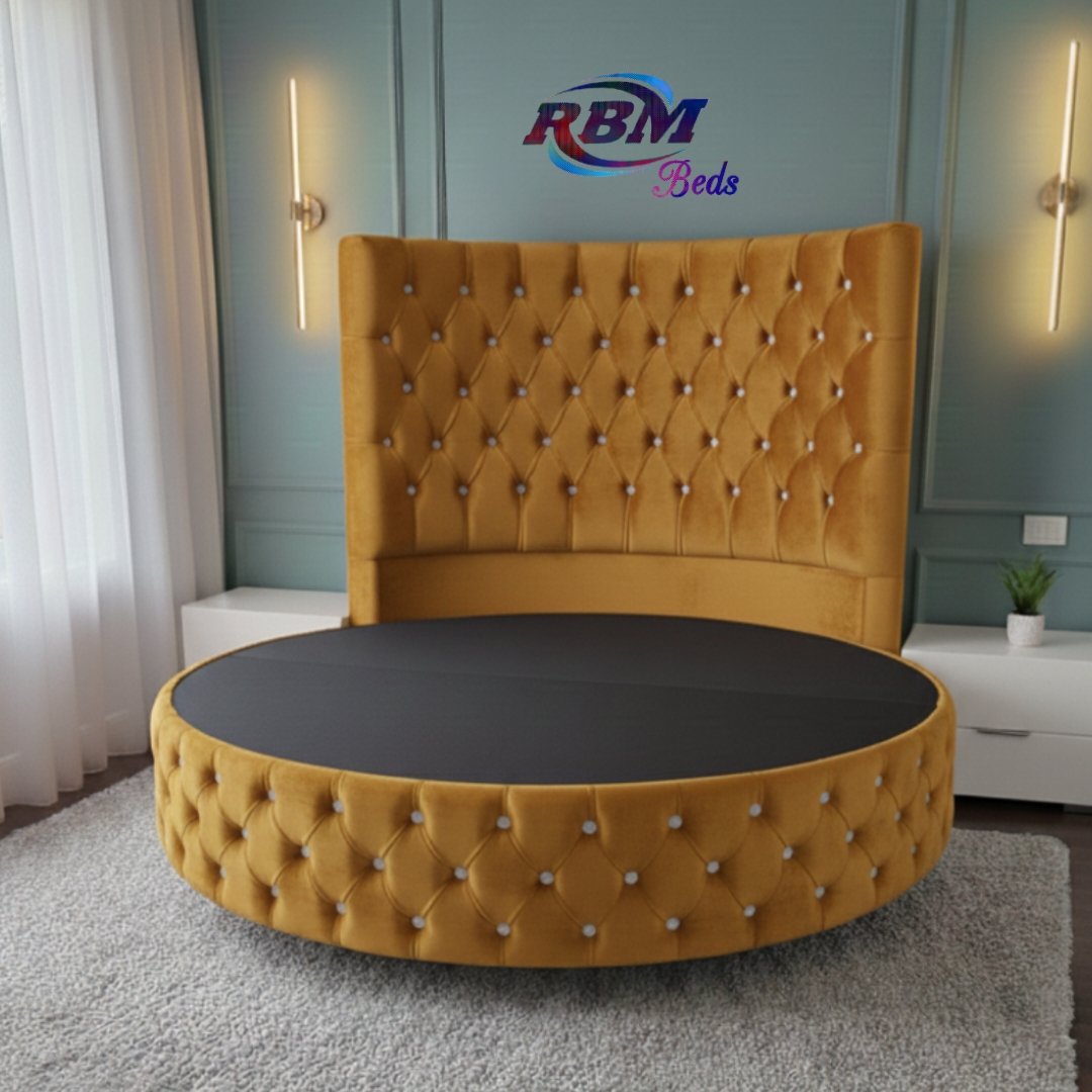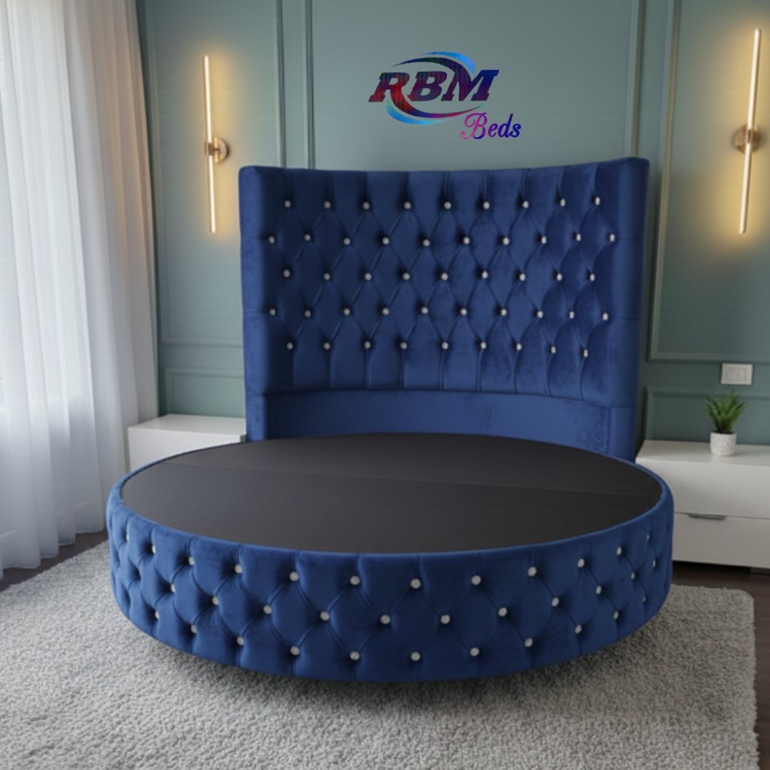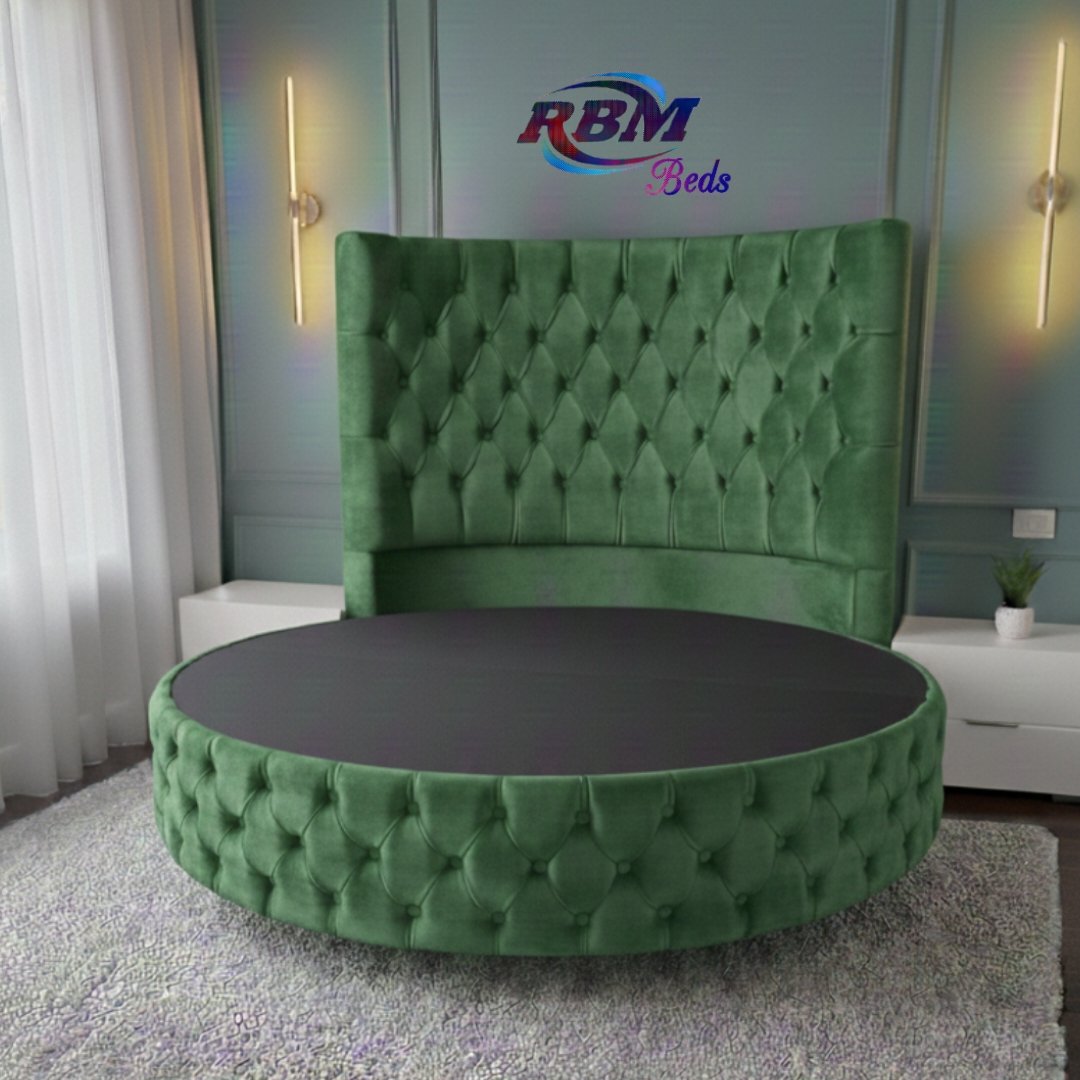 The Circular Round Bed will bring theatrical glamour to your bedroom. Designed for immediate impact and handmade exclusively in the UK, this stunning circular bed is an iconic centrepiece for your home with buttons and Diamonds details. The solid structured base separates into two half-moon sections, which gives you ease of access to most bedrooms. The headboard goes directly against the wall and does not require any fixing. Our round beds are simply placed against the wall. The half-moon round bases fit neatly and securely inside the headboard, slotting directly into place. Once positioned, the mattress is placed on top to complete the setup. Our Footstools and Blanket Box etc don’t come in a rounded shape; they are supplied in a rectangular shape.