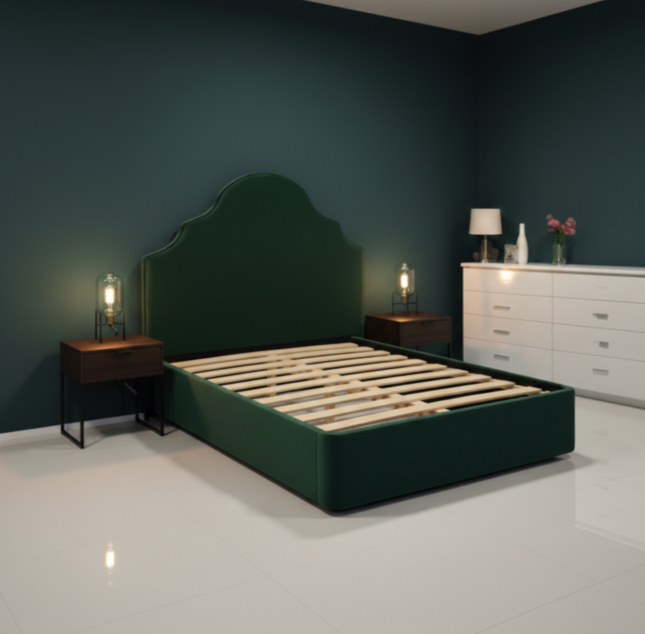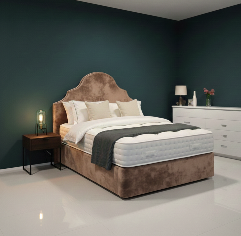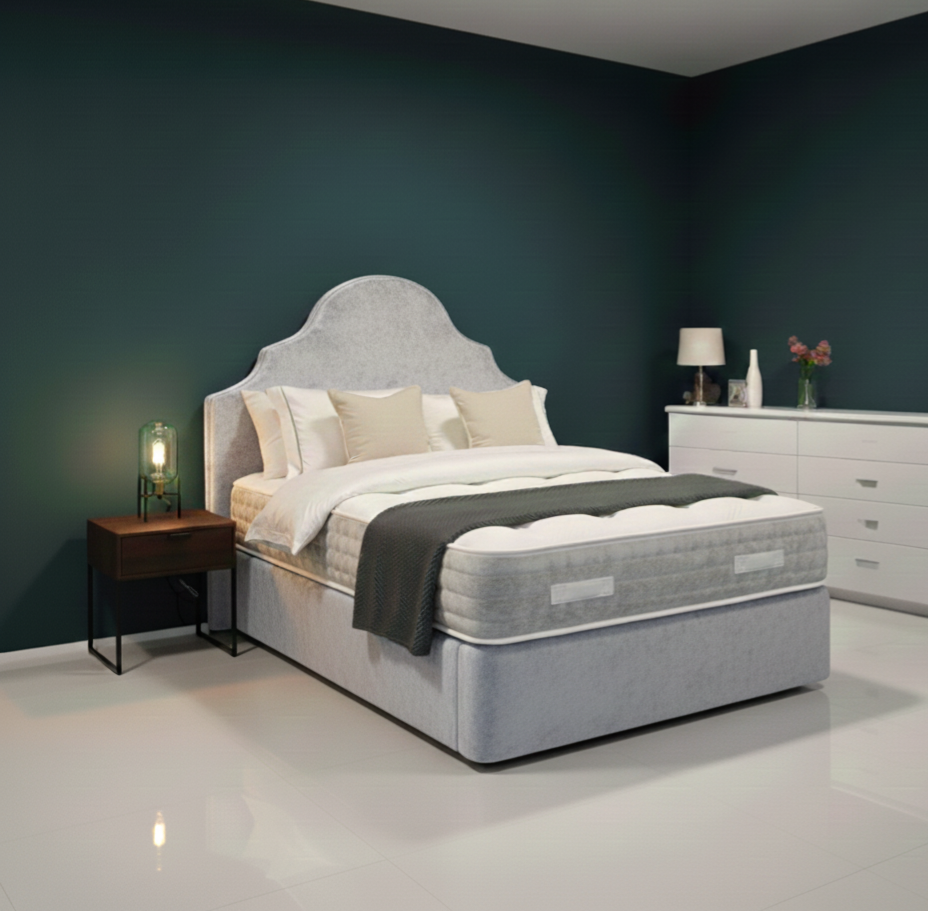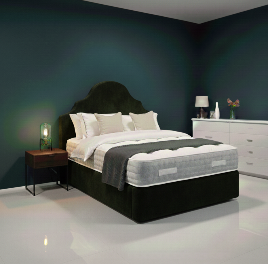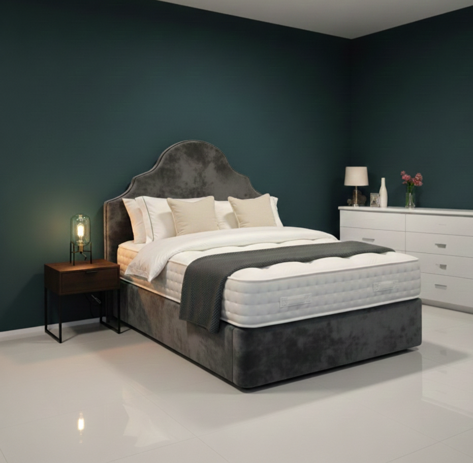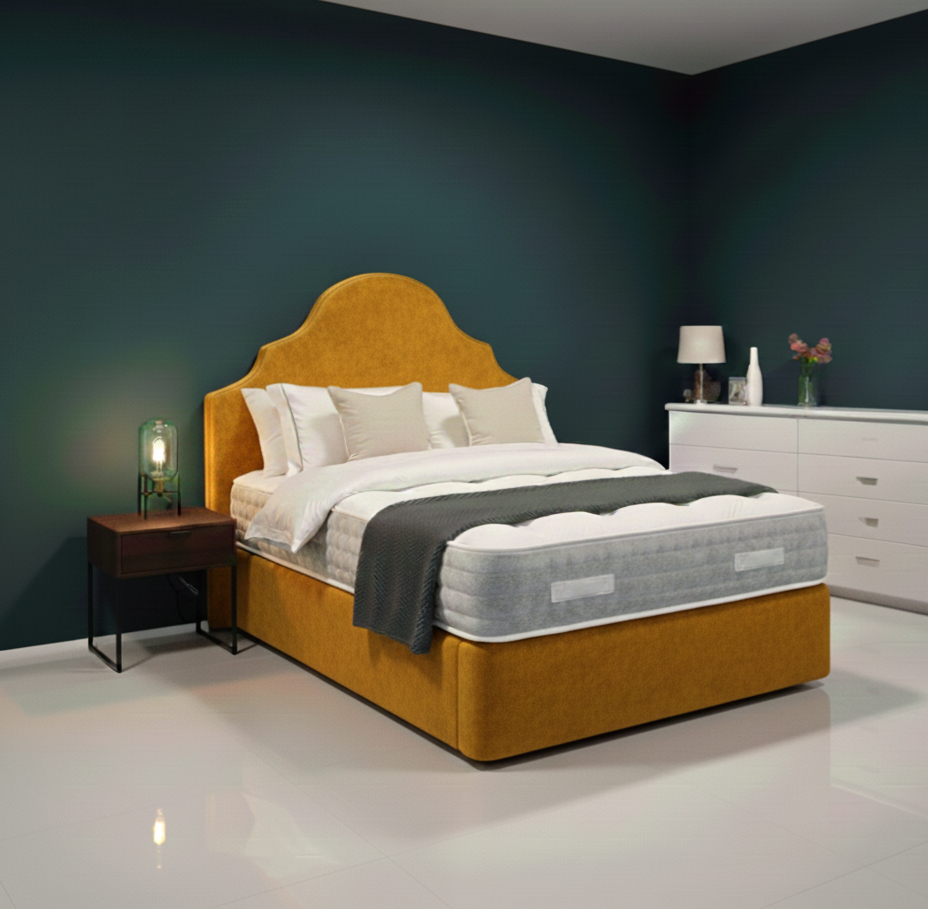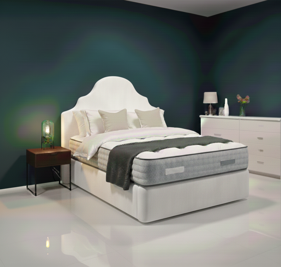 Curved beds feature a gracefully curved headboard, offering both comfort and a touch of sophistication. They come with a matching upholstered base, which can be customized with storage or slatted base options. This bed is available in a wide array of colors, fabrics, sizes, headboard heights, and storage configurations, allowing for complete personalization to suit any taste and interior design.