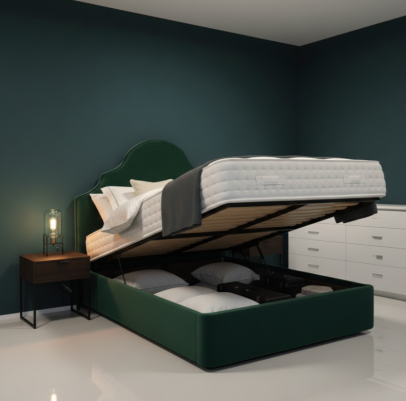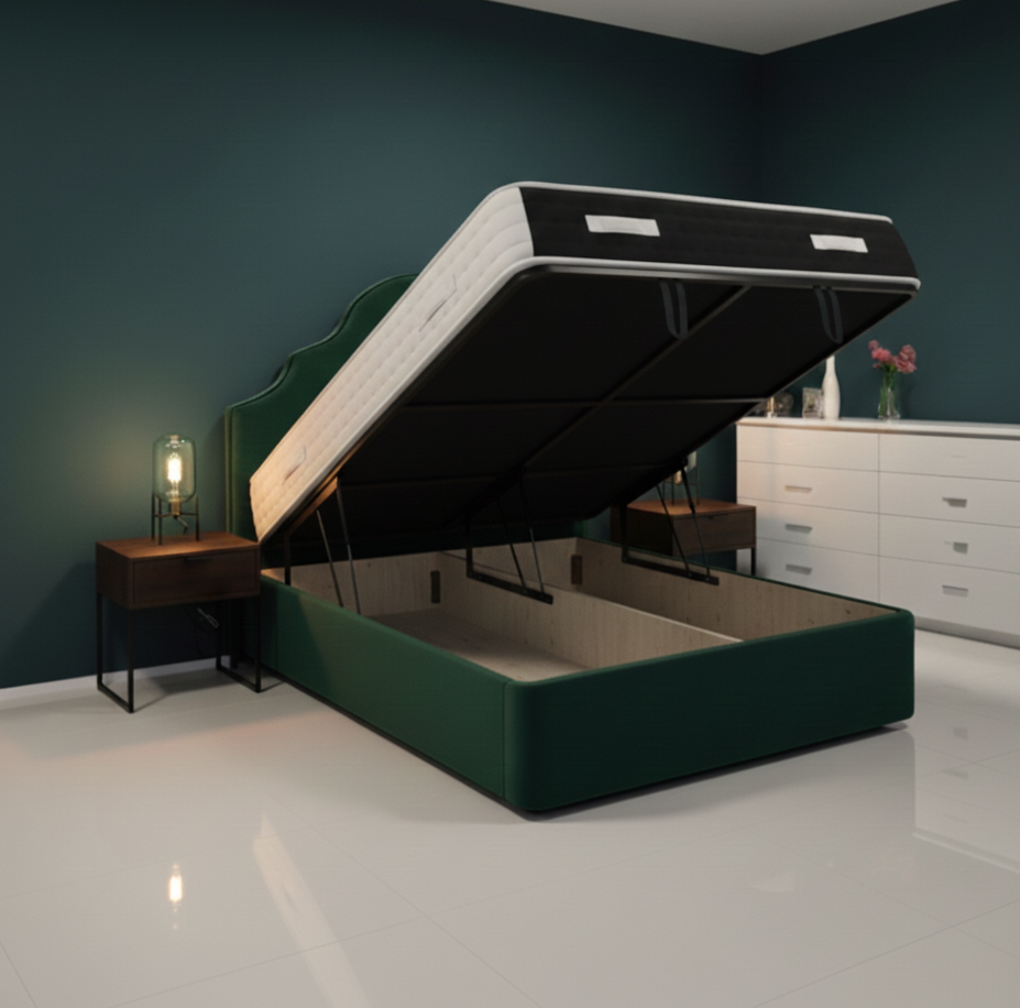 Our storage beds are intentionally designed without an internal base panel. Stored belongings sit directly on the floor, which helps protect the structure of the bed by reducing excess weight and maintaining overall balance. The lift-up design allows full use of the space beneath the mattress, while the neatly positioned side rails keep stored items discreetly hidden from view for a tidy finish.
