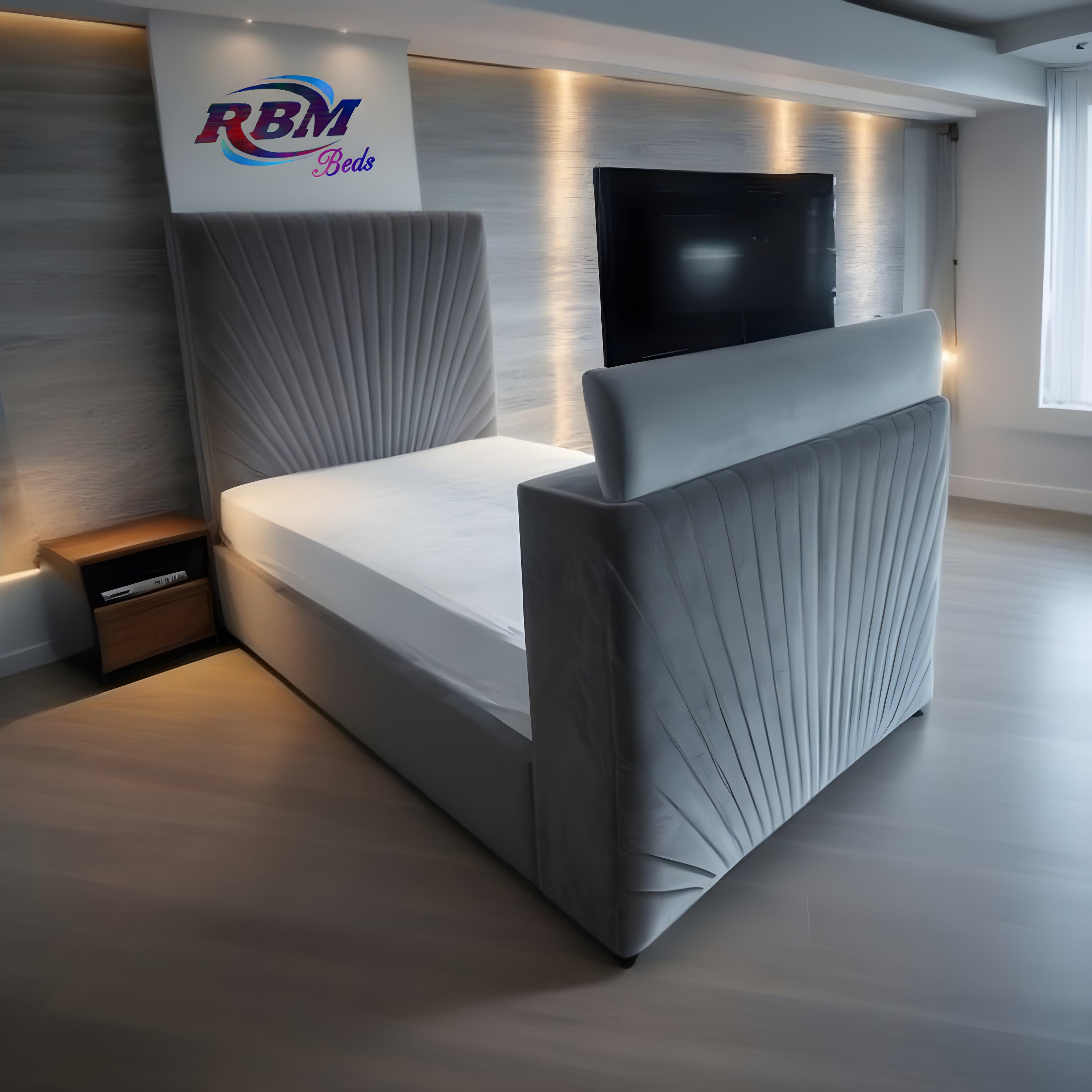 TV Beds comes with Electric Wireless Remote TV Lift Mechanism tucked away in the footboard, allowing users to raise their TV with the push of a button. A wireless and one spare wired remote control are included, along with TV holding brackets designed to fit any kind of TV in it.