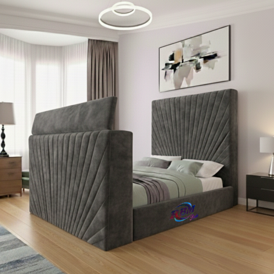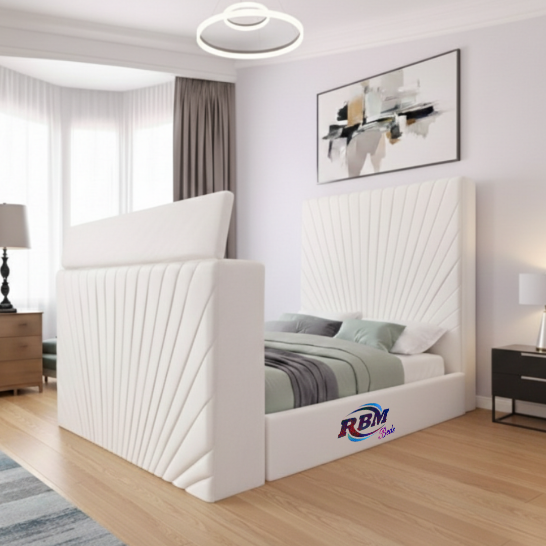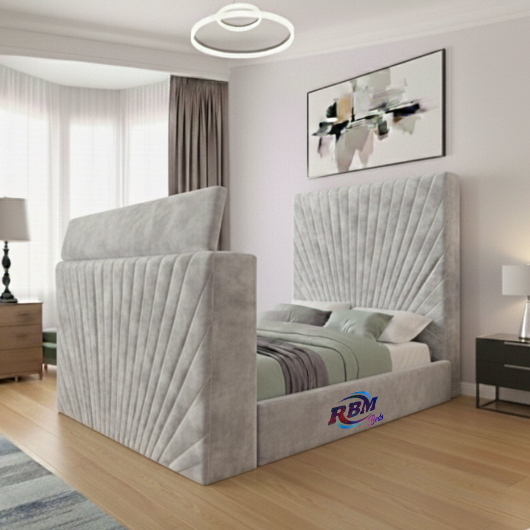Emri TV Beds comes with Electric Wireless Remote TV Lift Mechanism tucked away in the footboard, allowing users to raise their TV with the push of a button. A wireless and one spare wired remote control are included, along with TV holding brackets designed to fit any kind of TV in it.