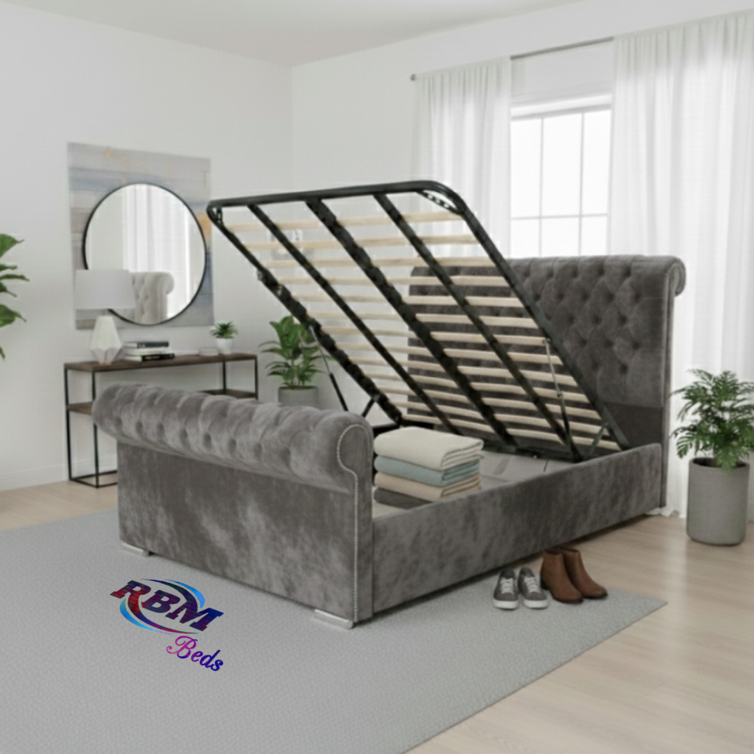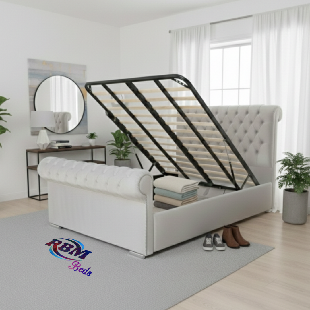 The gas-lift ottoman mechanism is supported with durable gas pistons, allowing easy access to your storage space. Once the ottoman is raised it will hold position allowing you to be hands-free. Our Ottoman Gas Lift Storage beds are intentionally designed without an internal base panel. Stored belongings sit directly on the floor, which helps protect the structure of the bed by reducing excess weight and maintaining overall balance. The lift-up design allows full use of the space beneath the mattress, while the neatly positioned side rails keep stored items discreetly hidden from view for a tidy finish.